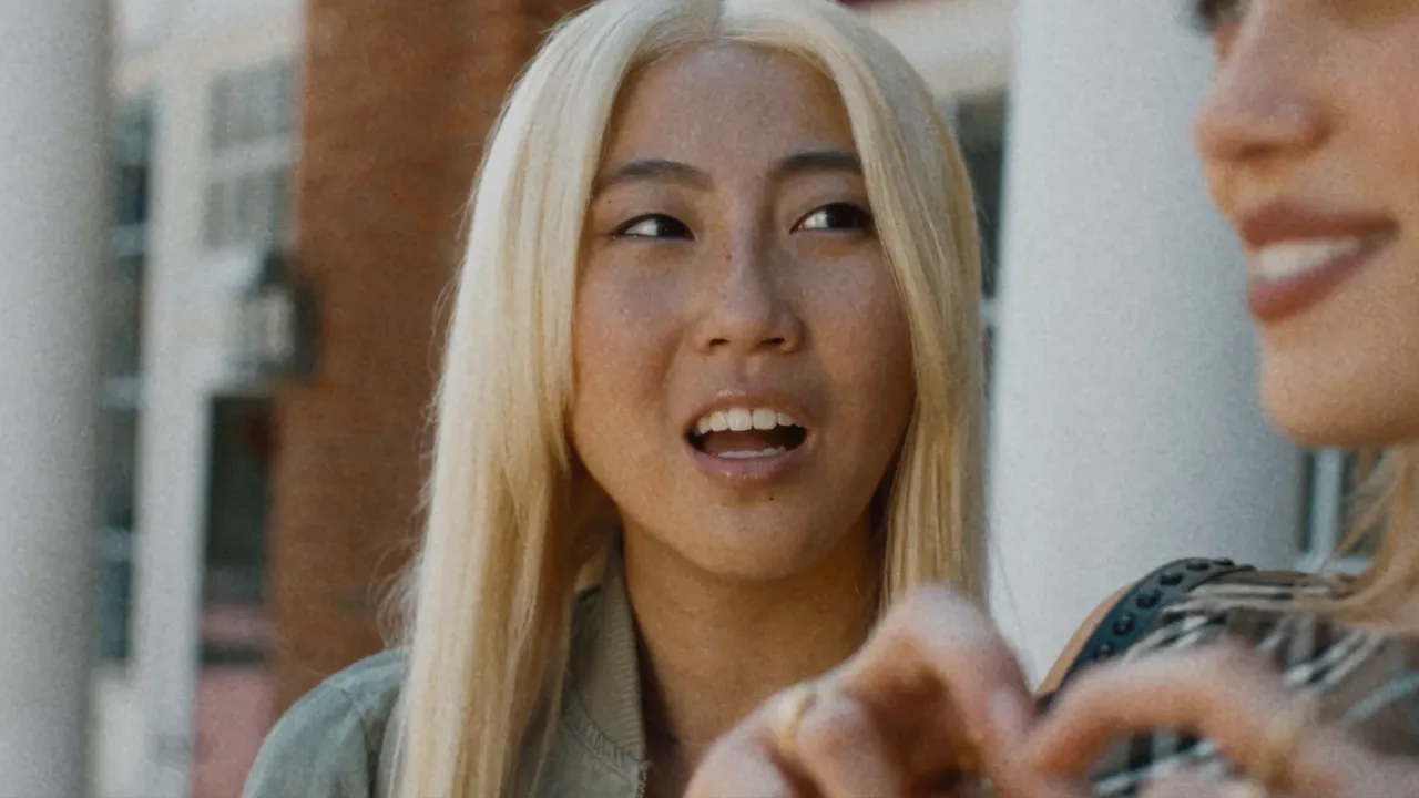 The ugliness of racism shows up on several rather curious occasions. Of these, a bleakly comic karaoke music video called “It’s Good to Be White” trumpets the joys of white supremacy, taking center stage in one of the film’s most unsettling scenes. But Wang plants additional markers of America’s awful tendency toward bigotry and intolerance. For example, the mascot of Joan’s high school is the Wizards, but the logo looks more like a Klansman than Merlin the Magician. The blonde homogeneity of Olivia’s clique has a whiff of Stepford Wives-style conformity, especially when everyone shakes their dressing and salad containers in the lunchroom. These touches, however, are spaced far enough apart that we frequently second-guess Wang’s intended tone.